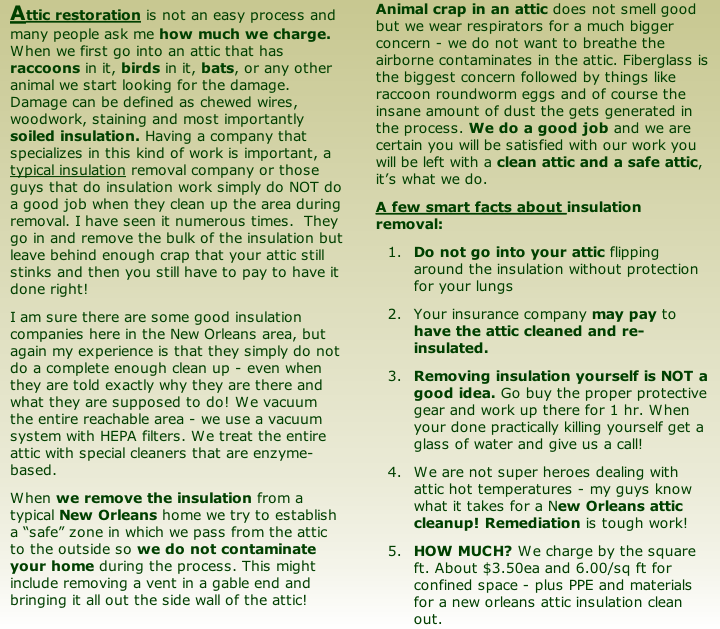 New Orleans Honeybee removal Click HERE Protective gear for attic insulation cleanouts - New Orleans Protective gear for New Orleans attic insulation cleanout Respirator for New Orleans attic insulation cleanout Dead animal attic insulation cleanup - This is nasty contaminated insulation